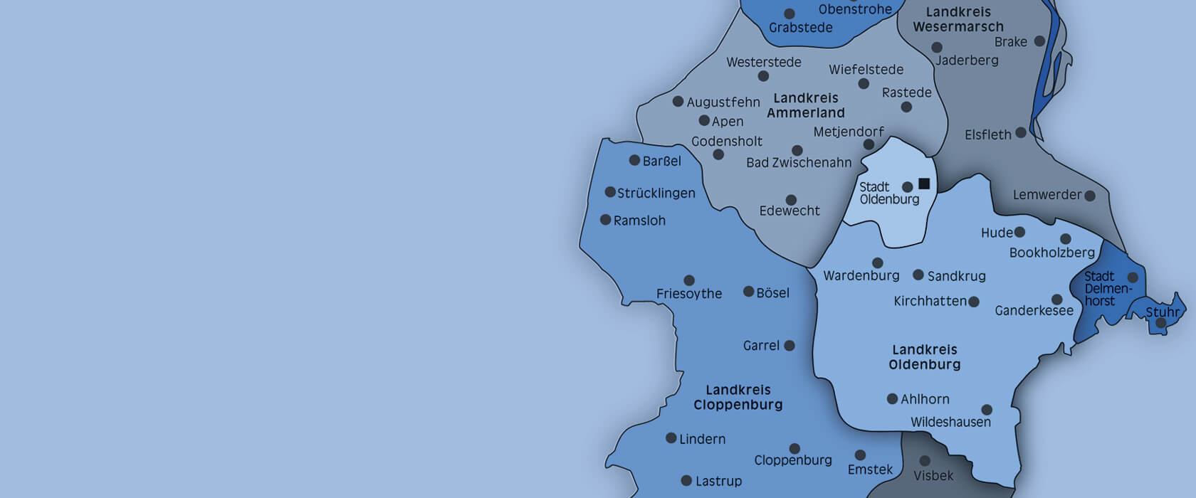 Mit rund 80 Geschäftsstellen und 3 Schadenschnelldiensten sind wir überall im Oldenburger Land präsent und bilden flächendeckend ein dichtes Servicenetz. Unsere Kundennähe, Leistungsstärke und Zuverlässigkeit sind die Basis für die dauerhaften und vertrauensvollen Beziehungen zu unseren Kunden.